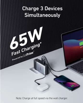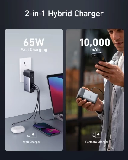بطارية شحن محمول وجداري 733 اثنان في واحد من انكر، بسعة 10000 مللي امبير، منفذ يو اس بي سي 30 واط مع شاحن جداري بسعة 65 واط، A1651211- اسود